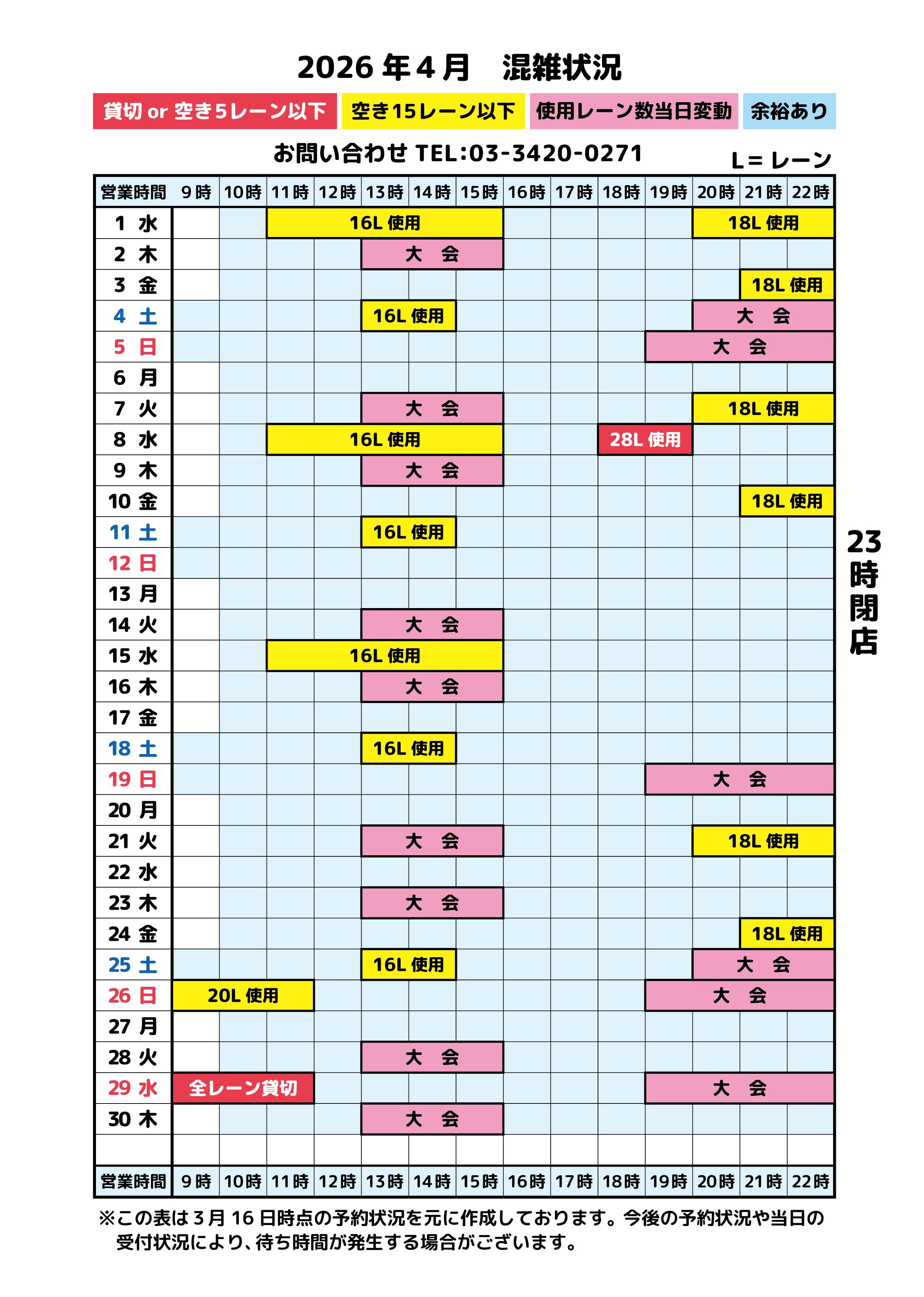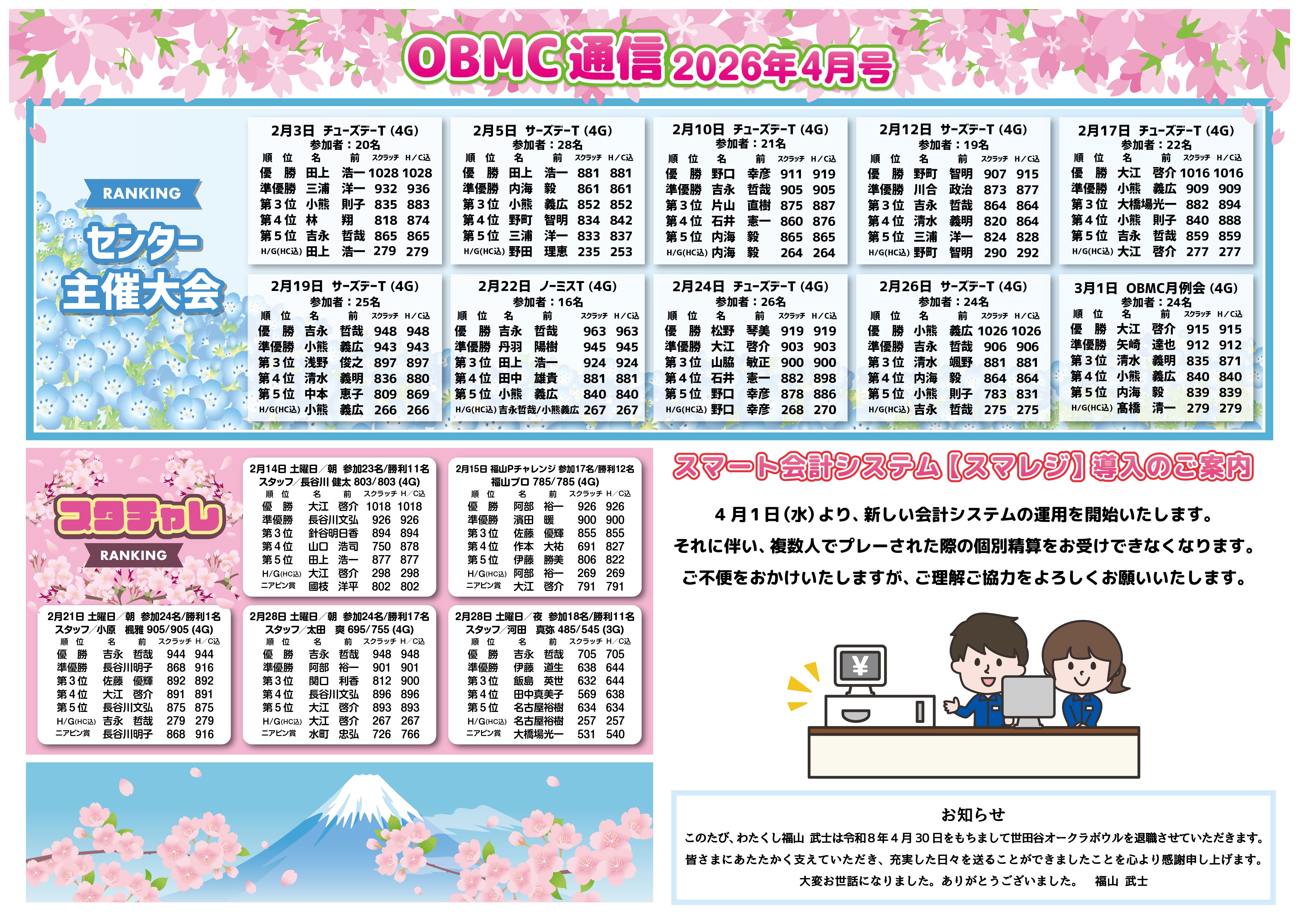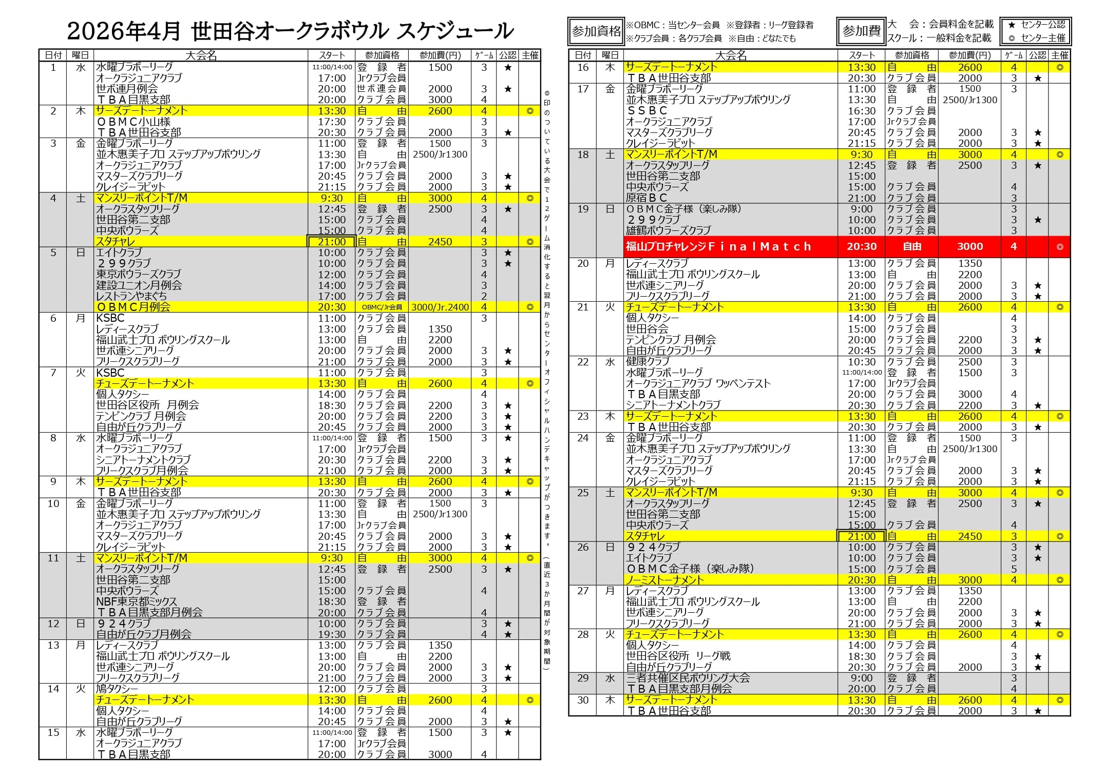 ※現在SPECTO稼働停止中です。復旧まで暫くお時間いただきます。 【2026年4月分スケジュール】 2026/3/29 「2026.4月レーン情報」 「2026.4月スケジュール」(会報)を更新いたしました。 2026/3/21 「パーフェクト達成ボウラー」を更新いたしました。 2026/2/26 「2026.3月レーン情報」 「2026.3月スケジュール」(会報)を更新いたしました。 2026/1/22 「2026.2月レーン情報」 「2026.2月スケジュール」(会報)を更新いたしました。 2026/1/9 「パーフェクト達成ボウラー」を更新いたしました。 2025/12/25 「パーフェクト達成ボウラー」を更新いたしました。 2025/12/23 「2026.1月レーン情報」 「2026.1月スケジュール」(会報)を更新いたしました。 2025/12/13 「パーフェクト達成ボウラー」を更新いたしました。 2025/12/6 「パーフェクト達成ボウラー」を更新いたしました。 2025/12/3 「パーフェクト達成ボウラー」を更新いたしました。 2025/11/22 「12月レーン情報」 「12月スケジュール」(会報)を更新いたしました。 2025/11/4 「800シリーズ達成ボウラー」を更新いたしました。 2025/11/4 「パーフェクト達成ボウラー」を更新いたしました。 ★ブログをチェック!「イベント情報」「最新情報」「混雑予報」掲載しています オークラランドのボウリング場ブログ で最新情報をチェック! ボウリング場トップ 営業案内 スクール・プロレッスン 所属プロ紹介 パーフェクト達成ボウラー プロショップ情報 レーン情報 ゲームコーナー SPECTO Tweets by Okura_setagaya 世田谷 オークラボウル
